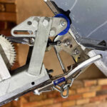 There are 4 adjustment horizontal positions. The bolts locate in one of these and the other pair of bolts go in slotted holes, allowing the roller/wedge to swing up/down for vertical adjustment. This can project out 43 to 91 mm. (1.7โ to 3.6โ)